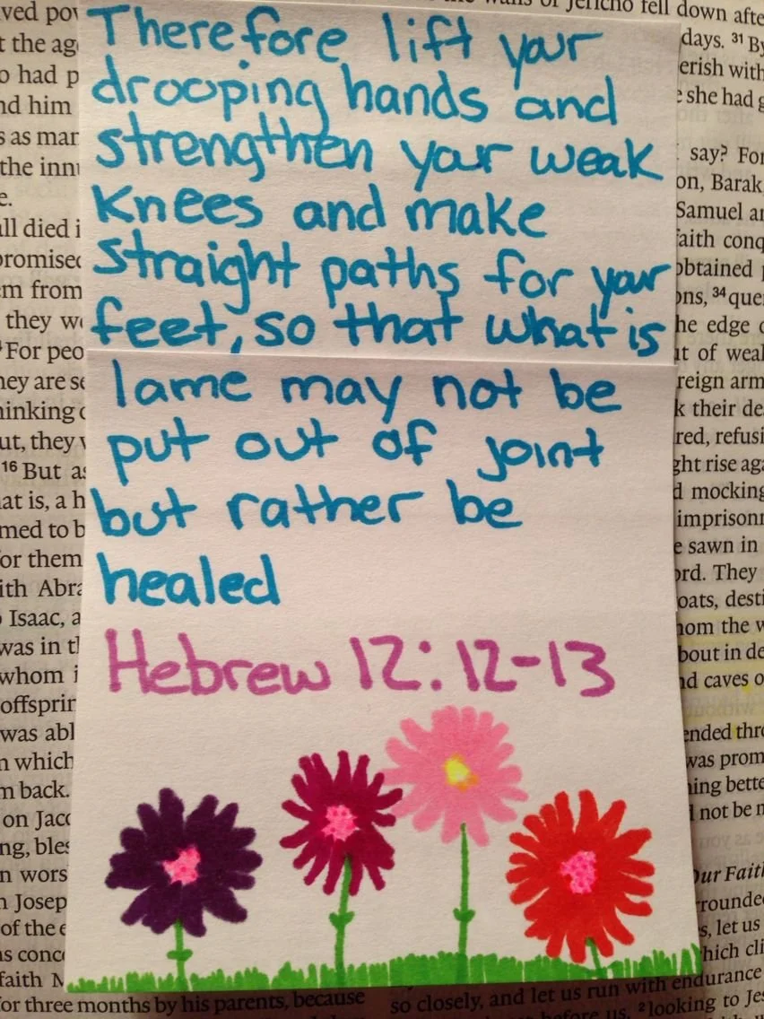 “Therefore, strengthen your feeble arms and weak knees. ‘Make level paths for your feet,’ so that the lame may not be disabled, but rather healed.” Hebrews 12:12-13